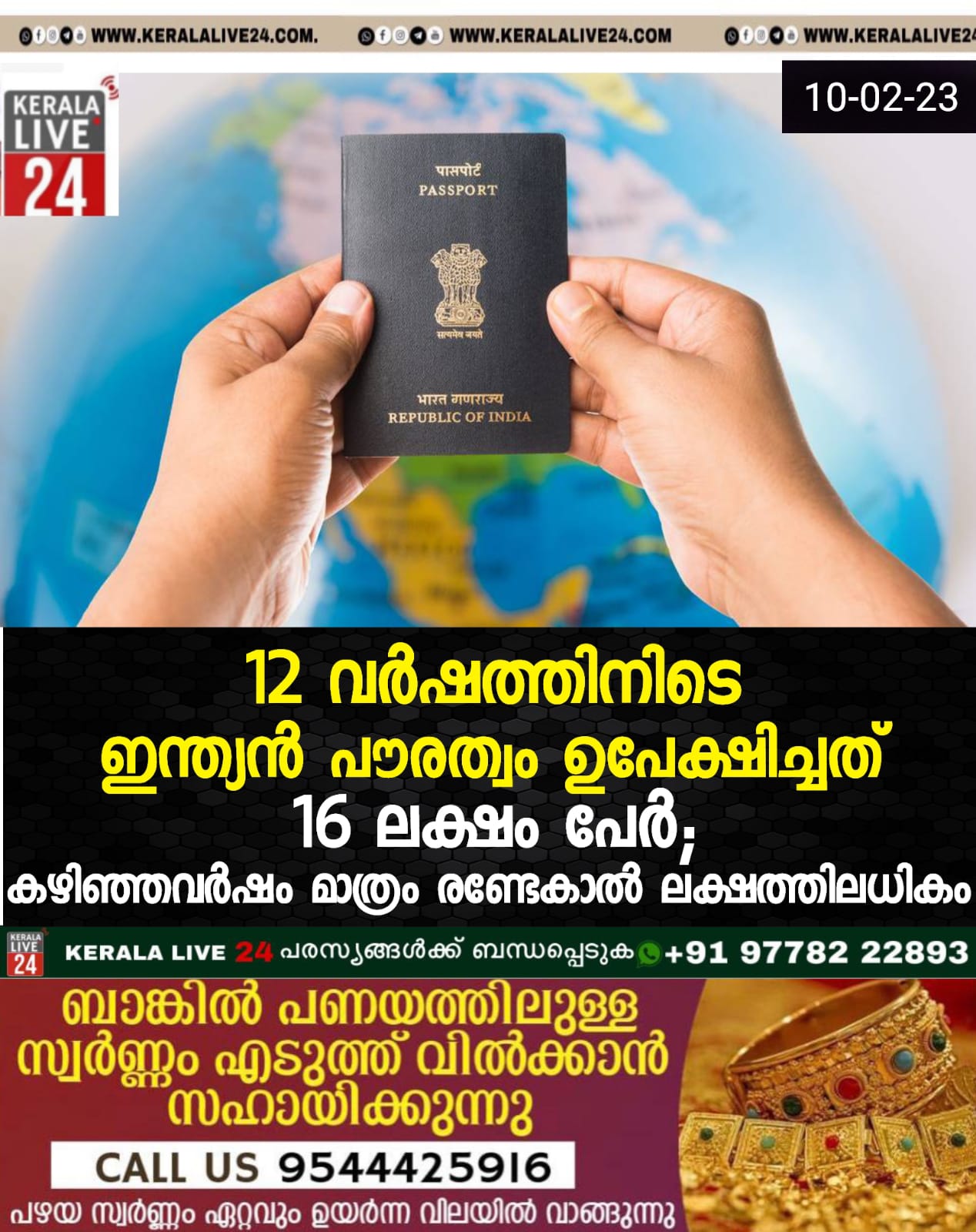 ന്യൂഡൽഹി: 2011 മുതൽ 16 ലക്ഷത്തിലധികം ഇന്ത്യക്കാർ പൗരത്വം ഉപേക്ഷിച്ചു. കഴിഞ്ഞ വർഷം മാത്രം പൗരത്വം ഉപേക്ഷിച്ചത് 2,25,620 പേരാണെന്നും കേന്ദ്രസർക്കാർ റിപ്പോർട്ട്. 2011 മുതൽ ഏറ്റവും കൂടുതൽ പൗരത്വം ഉപേക്ഷിച്ചത് കഴിഞ്ഞവർഷമാണെന്നും കണക്കുകൾ പറയുന്നു. 2020ൽ പൗരത്വം ഉപേക്ഷിച്ചത് 85,256 പേരാണ് പൗരത്വവുമായി ബന്ധപ്പെട്ട ചോദ്യത്തിന് വിദേശകാര്യ മന്ത്രി എസ്.ജയശങ്കർ രാജ്യസഭയിൽ രേഖാമൂലം നൽകിയ മറുപടിയിലാണ് ഇക്കാര്യം വ്യക്തമാക്കിയത്.