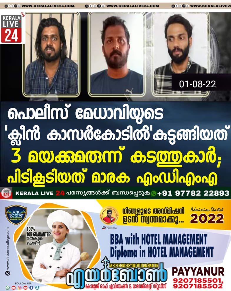 ക്ലീന് കാസറഗോഡ് ഓപ്പറേഷന്റെ ഭാഗമായി നടത്തിയ പരിശോധനയില് 20 ഗ്രാം എം.ഡി.എം എ പിടികൂടി. സംഭവുമായി ബന്ധപ്പെട്ട് മൂന്നുപേരെ അറസ്റ്റ് ചെയ്തു.