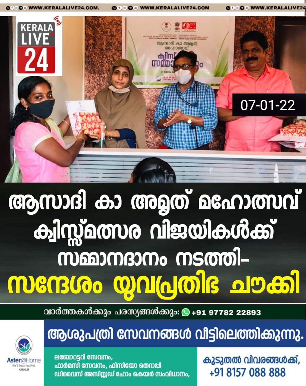 ചൗക്കി:കേന്ദ്ര ഗവൺമെന്റിന്റെ വാർത്താ വിനിമയ പ്രക്ഷേപണ മന്ത്രാലയത്തിന്റെ കീഴിലുള്ള ഫീൽഡ് ഔട്ട് റീച്ച് ബ്യൂറോ കണ്ണൂരിന്റേയും നെഹ്റു യുവക് കേന്ദ്ര കാസറഗോഡിന്റെയും സംയുക്താഭിമുഖ്യത്തിൽ ചൗക്കി സന്ദേശം യുവപ്രതിഭയിൽ വെച്ച് സ്വാതന്ത്ര്യത്തിന്റെ 75ാം വാർഷികാഘോഷത്തിന്റെ ഭാഗമായി നടത്തുന്ന ആസാദി കാ അമ്യത് മഹോത്സവ് / ക്വിസ്സ് മത്സരം നടത്തി.