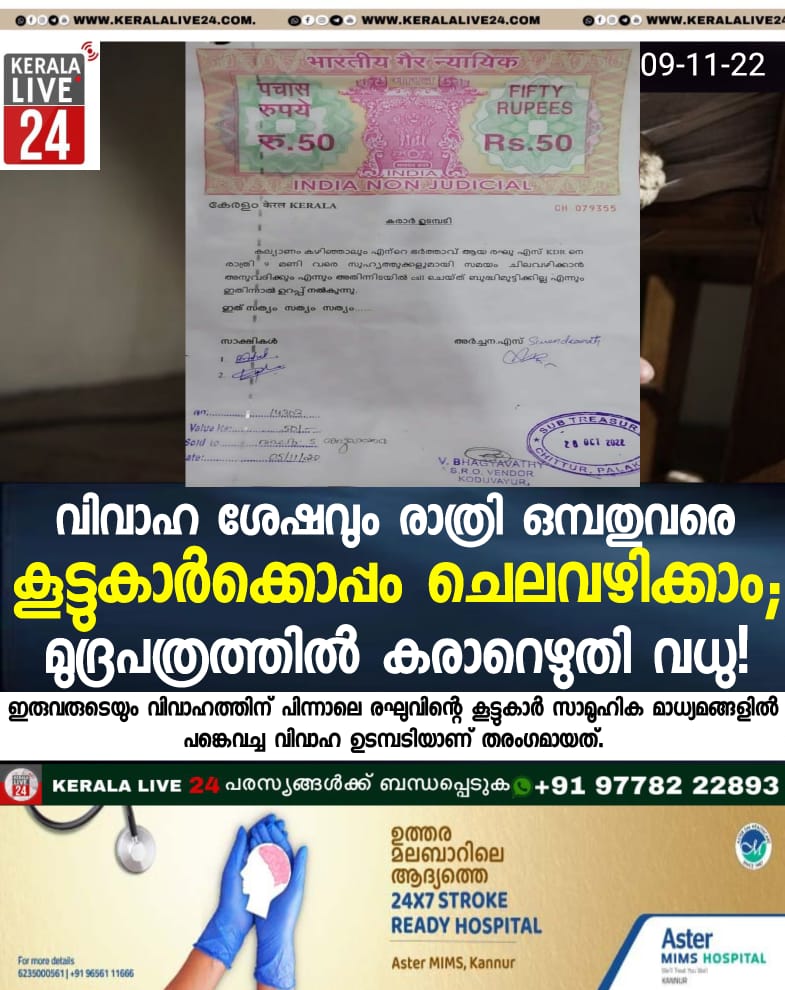രാത്രി ഒമ്പത് മണിവരെ കൂട്ടുകാര്ക്കൊപ്പം ചെലവഴിക്കാമെന്നും അതുവരെ ഭര്ത്താവിനെ ഫോണ് ചെയ്ത് ശല്യം ചെയ്യില്ലെന്നും മൂന്ന് തവണ സത്യം ചെയ്യുന്ന മുദ്രപത്രം പെട്ടെന്ന് തന്നെ സാമൂഹിക മാധ്യമങ്ങളില് തരംഗമായി. വിവാഹ ഉടമ്പടിയോടെ രഘുവും ഭാര്യ അര്ച്ചനയും നാട്ടിലെ താരങ്ങളായി. അര്ച്ചന ബാങ്ക് ജോലിക്കായുള്ള കോച്ചിങ്ങ് ക്ലാസുകളില് പങ്കെടുക്കുന്നു.