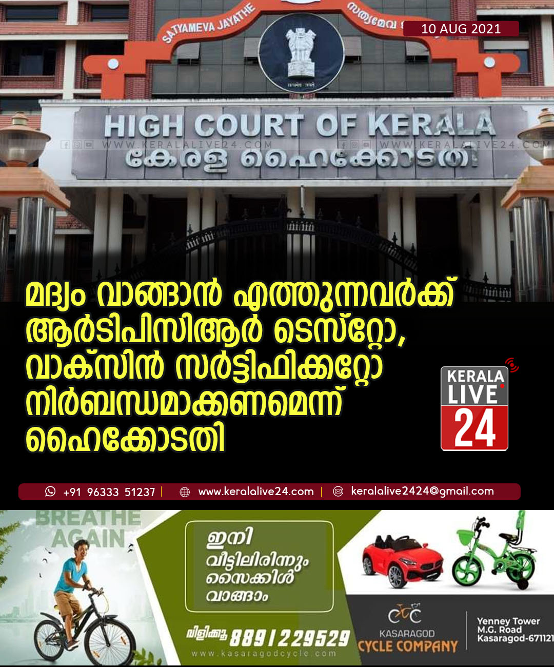 കൊച്ചി: സംസ്ഥാനത്തെ ബെവ്കോ ഔട്ട്ലെറ്റുകളിൽ ഇപ്പോഴും വലിയ തിരക്കാണ് അതിനാൽ മദ്യം വാങ്ങാൻ എത്തുന്നവർക്കും ആർടിപിസിആർ ടെസ്റ്റോ, വാക്സിൻ സർട്ടിഫിക്കറ്റോ നിർബന്ധമാക്കണമെന്ന് ഹൈക്കോടതി.