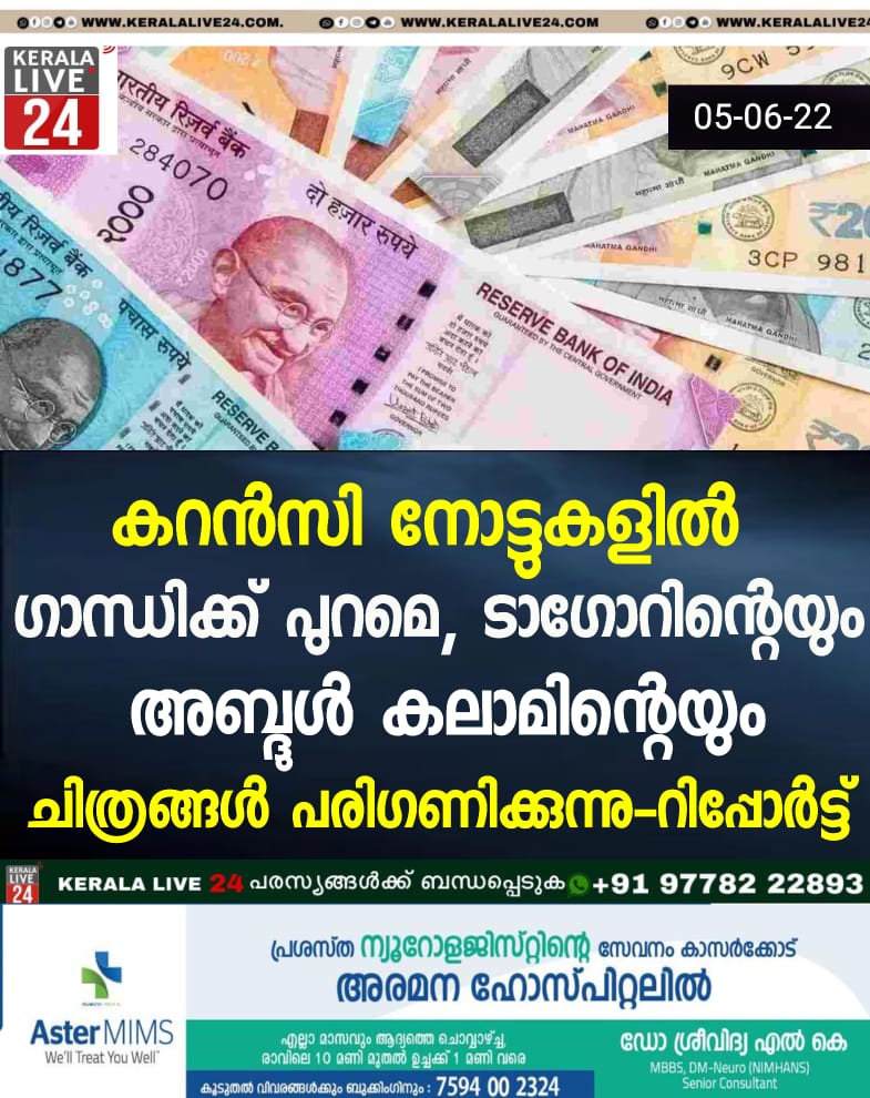 ദില്ലി: രാജ്യത്തെ കറൻസി നോട്ടുകളിൽ മഹാത്മാ ഗാന്ധിയുടെ ചിത്രത്തിന് പുറമ, രവീന്ദ്രനാഥ ടാഗോറിനെയും എപിജെ അബ്ദുൾ കലാമിനെയും ഉൾപ്പെടുത്താൻ ആലോചിക്കുന്നതായി റിപ്പോർട്ട്. ദ ന്യൂ ഇന്ത്യൻ എക്സ്പ്രസാണ് റിപ്പോർട്ട് പുറത്തുവിട്ടത്. ടാഗോറിന്റെയും കലാമിന്റെയും വാട്ടർമാർക്ക് ചിത്രങ്ങൾ കറൻസികളിൽ ഉപയോഗിക്കുന്നത് ധനമന്ത്രാലയവും റിസർവ് ബാങ്ക് ഓഫ് ഇന്ത്യയും (ആർബിഐ) പരിഗണിക്കുന്നതായാണ് റിപ്പോർട്ടിൽ പറയുന്നത്. ആദ്യമായാണ് മഹാത്മാഗാന്ധി ഒഴികെയുള്ള പ്രമുഖ വ്യക്തികളുടെ ചിത്രങ്ങൾ നോട്ടുകളിൽ ഉപയോഗിക്കാൻ ആർബിഐ ആലോചിക്കുന്നത്.ആർബിഐക്കും ധനമന്ത്രാലയത്തിന് കീഴിലുള്ള സെക്യൂരിറ്റി പ്രിന്റിംഗ് ആൻഡ് മിന്റിങ് കോർപ്പറേഷൻ ഓഫ് ഇന്ത്യയും ഗാന്ധി, ടാഗോർ, കലാം വാട്ടർമാർക്കുകളുടെ രണ്ട് വ്യത്യസ്ത സെറ്റ് സാമ്പിളുകൾ വിദഗ്ധ പരിശോധനക്കായി ഐഐടി ദില്ലി എമറിറ്റസ് പ്രൊഫസർ ദിലീപ് ടി ഷഹാനിക്ക് അയച്ചെന്നും റിപ്പോർട്ടിൽ പറയുന്നു. ഷഹാനി തെരഞ്ഞെടുക്കുന്ന സാമ്പിൾ സർക്കാരിന്റെ അന്തിമ പരിഗണനക്ക് നൽകാനായി അദ്ദേഹത്തോട് നിർദേശിച്ചെന്നും റിപ്പോർട്ടിൽ പറയുന്നു.