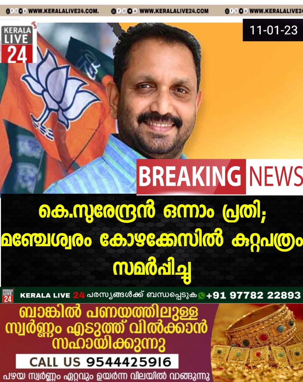 കെ.സുരേന്ദ്രൻ ഒന്നാം പ്രതി; മഞ്ചേശ്വരം കോഴക്കേസില്‍ കുറ്റപത്രം സമർപ്പിച്ചു