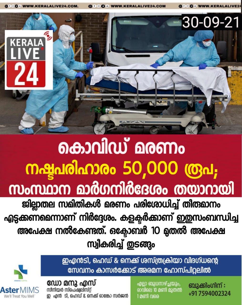 ജില്ലാതല സമിതികള് മരണം പരിശോധിച്ച് തീരുമാനം എടുക്കണമെന്നാണ് നിര്ദ്ദേശം. കളക്ടര്ക്കാണ് ഇതുസംബന്ധിച്ച അപേക്ഷ നല്കേണ്ടത്. ഒക്ടോബര് 10 മുതല് അപേക്ഷ സ്വീകരിച്ച് തുടങ്ങും. ജില്ലാതലത്തില് ഡിഎംഒ, എഡിഎം, വിദഗ്ധനായ ഡോക്ടര് ഉള്പ്പടെ അഞ്ച് അംഗങ്ങള് ഉണ്ടായിരിക്കണം. നടപടികള് പരമാവധി ഓണ്ലൈന് ആയിരിക്കും. കൊവിഡ് മരണത്തില് 50,000 രൂപ നഷ്ടപരിഹാരം അനുവദിച്ചു ഉത്തരവ് നേരത്തെ ഇറങ്ങിയിരുന്നു.