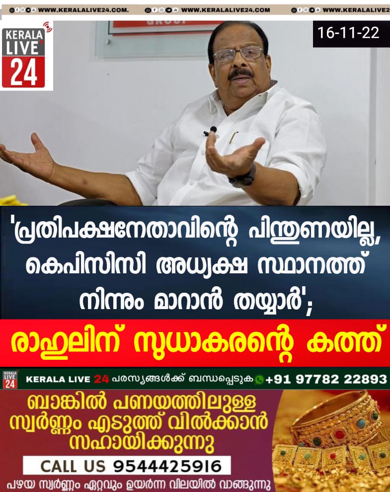 തിരുവനന്തപുരം : കെപിസിസി അധ്യക്ഷ സ്ഥാനത്ത് നിന്നും മാറ്റാൻ സന്നദ്ധതയറിയിച്ച് കെ സുധാകരൻ. വയനാട് എംപി രാഹുൽ ഗാന്ധിക്ക് കത്തയച്ചു. ആരോഗ്യ പ്രശ്നങ്ങൾ ചൂണ്ടിക്കാട്ടിയാണ് കത്ത് നൽകിയത്. കെപിസിസിയും പ്രതിപക്ഷവും ഒന്നിച്ച് പോകുന്നില്ലെന്നും പ്രതിപക്ഷ നേതാവ് വിഡി സതീശനിൽ നിന്നും തനിക്ക് പിന്തുണ ലഭിക്കുന്നില്ലെന്നും സുധാകരൻ കത്തിൽ കുറ്റപ്പെടുത്തുന്നുണ്ട്. താൻ സ്ഥാനമൊഴിഞ്ഞാൽ പകരം ചെറുപ്പക്കാർക്ക് പദവി നൽകണമെന്ന് സുധാകരൻ കത്തിൽ ആവശ്യപ്പെട്ടു.