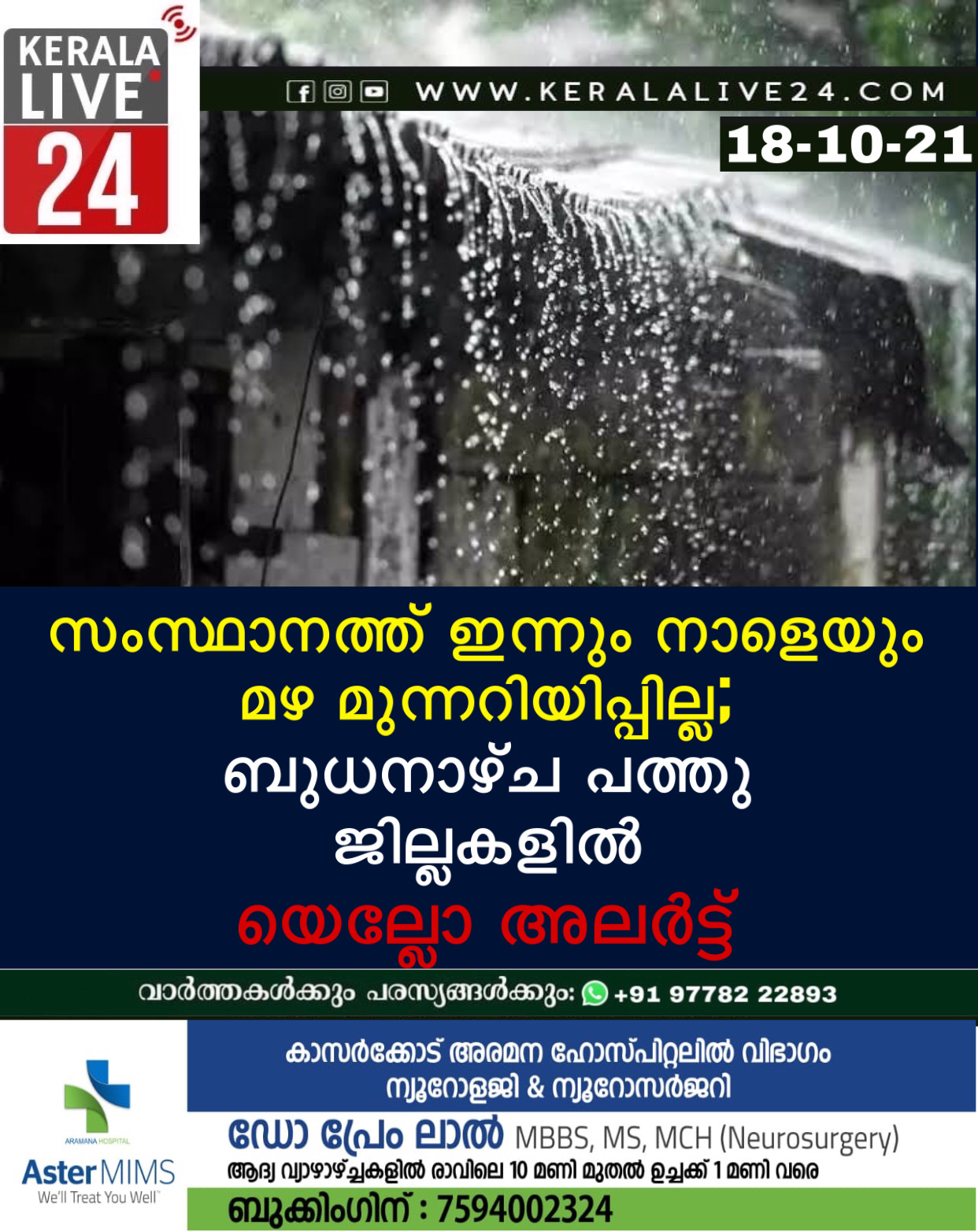 ബുധനാഴ്ചയാണ് ഇനി സംസ്ഥാനത്ത് മഴ ജാഗ്രതാ നിര്ദേശം ഉള്ളത്. അന്നു തിരുവനന്തപുരം മുതല് മലപ്പുറം വരെയുള്ള ജില്ലകളില് യെല്ലോ അലര്ട്ട് പ്രഖ്യാപിച്ചിട്ടുണ്ട്. കോഴിക്കോട് മുതല് കാസര്ക്കോട് വരെയുള്ള ജില്ലകളില് മുന്നറിയിപ്പില്ല.