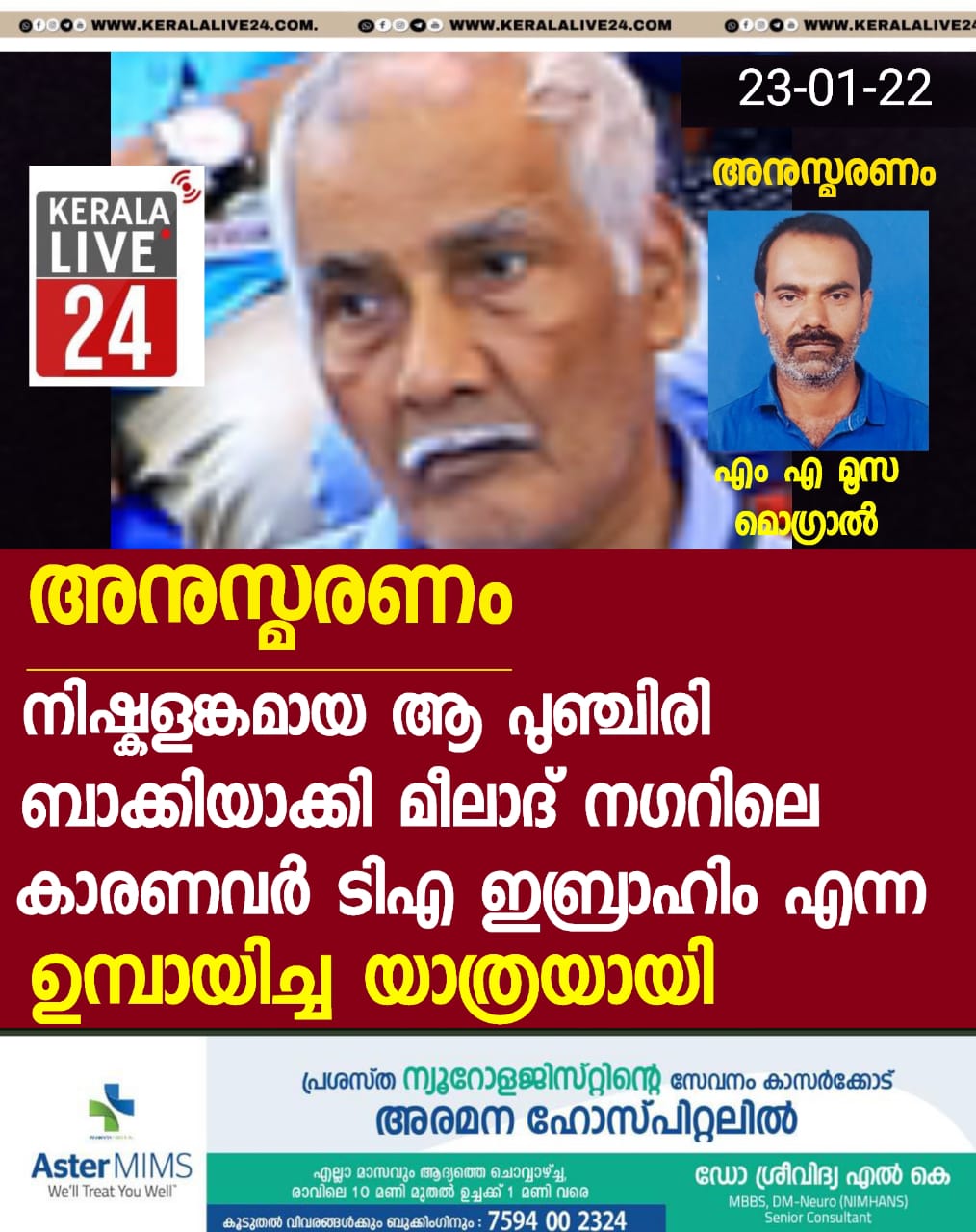 സൗമ്യമായ പെരുമാറ്റത്തിലൂടെ അളന്നുമുറിച്ച വാക്കുകളിലൂടെ ആരെയും നൊമ്പരപ്പെടുത്താതെ യുള്ള സ്വഭാവത്തിലൂ ടെയും, വളരെ സൂക്ഷ്മതയോടെയും ജീവിച്ച വ്യക്തിത്വമായിരുന്നു കഴിഞ്ഞാഴ്ച വിട പറഞ്ഞു പോയ മൊഗ്രാൽ മീലാദ് നഗറിലെ ടിഎ ഇബ്രാഹിം എന്ന ഉമ്പായിച്ചയുടേത്.