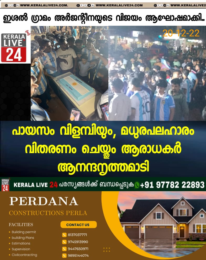 പായസം വിളമ്പിയും, മധുരപലഹാരം വിതരണം ചെയ്തും ആരാധകർ ആനന്ദനൃത്തമാടി…. ഇശൽ ഗ്രാമം അർജന്റീനയുടെ വിജയം ആഘോഷമാക്കി..